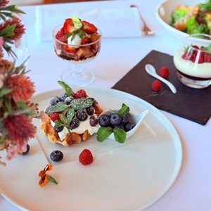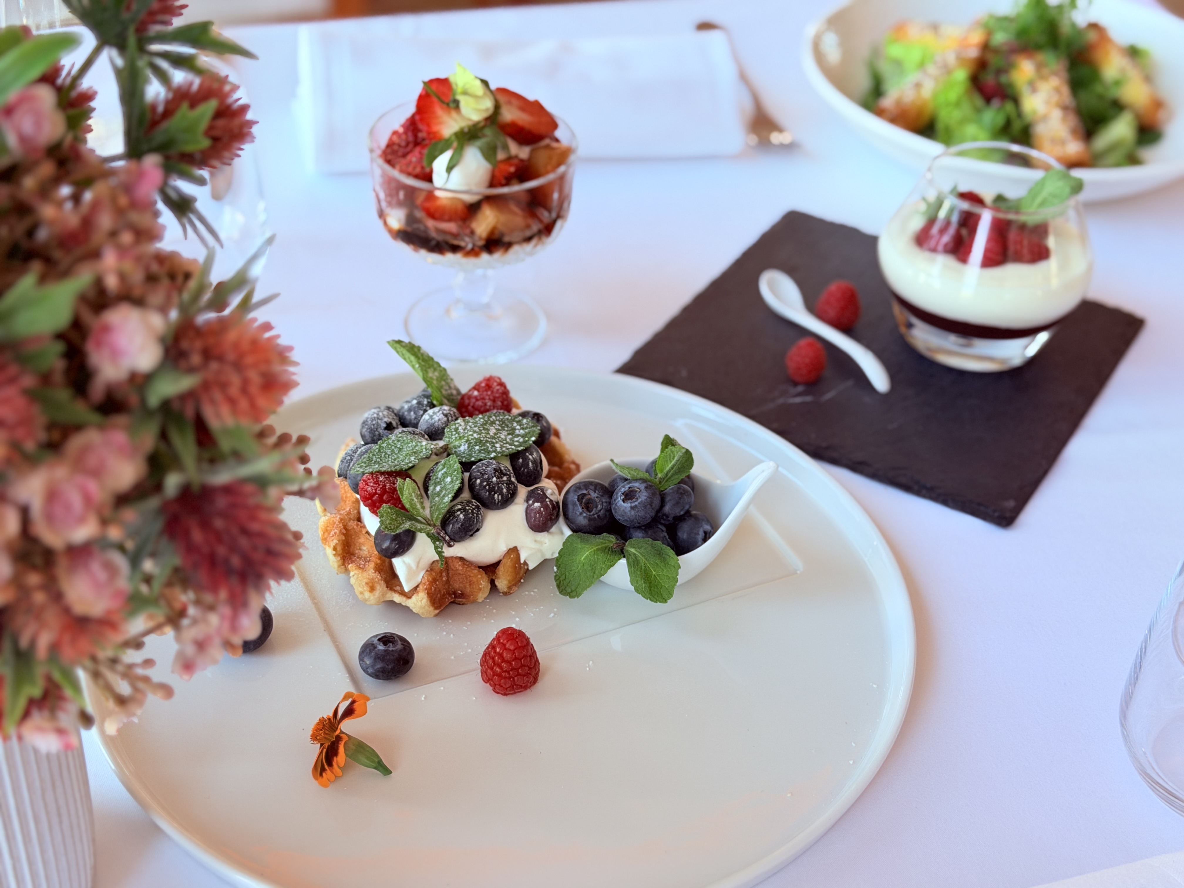 Wafli s Chantilly kremom, svježim borovnicama i mentom.
