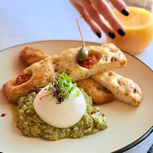 Kremasti baba ganoush, pečeno jaje i hrskavi baguette tost.