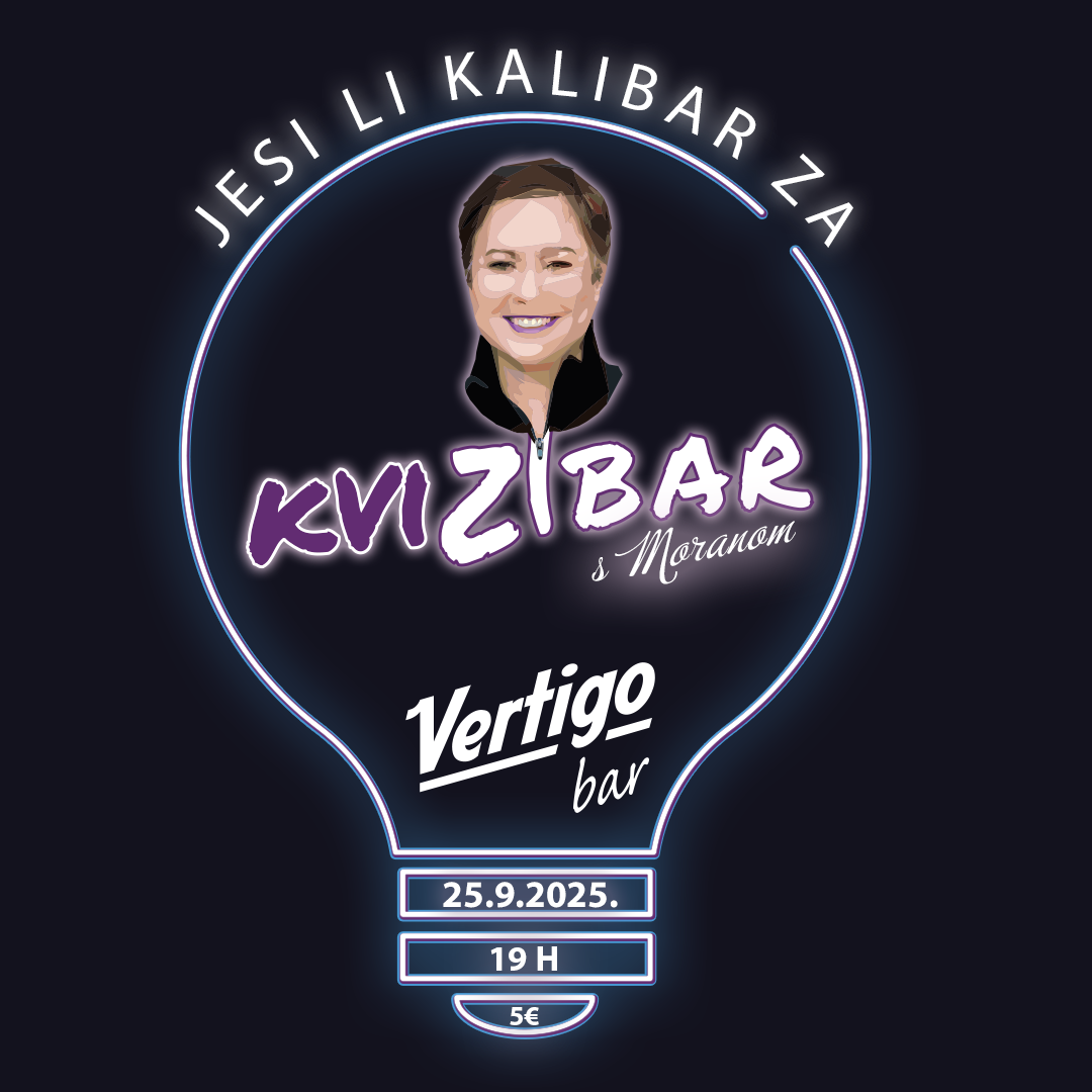 Pozivamo vas na večer znanja, zabave i dobrog društva – prvo izdanje pub kviza kviZibar održat će se u četvrtak, 25. rujna u Vertigo baru. Kviz vodi poznata kvizašica i lovkinja – Morana Zibar!